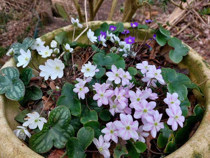 Hepatica Allerlei , 2mal pyranaica ( Harlekin rosa/weiß u. Harlekin blau / weiß , wobei das Blau leider komplett fehlt, die dritte ist Hep.