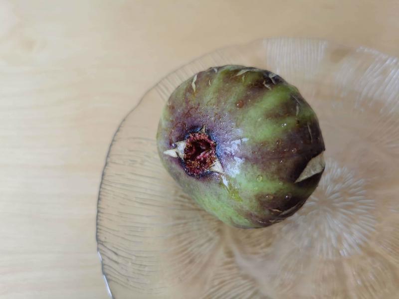 Ganze Feige: schmeckte sehr gut, die reifen weichen saftigen Teile am Rand zumindest.