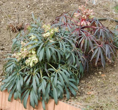 Die stinkende Nieswurz ursprünglich vor Jahren von mir gepflanzt wird im ganzen Garten von den Ameisen verteilt.Hier gleich die grün- und die rotblättriege zusammen an ihrem selbstgewählten Ort. (Eine hat sich selbst in einer grösseren Mauerspalte angesiedelt, dort hätte ich sie nie pflanzen können, sieht gelungen aus).