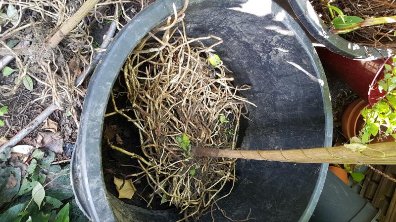 Um die ins Auto zu kriegen , werde ich sie auf 1/3 runterschneiden und in einen Wasser Kübel setzen.Die Wurzeln füllen den Kübel aus und was liebevoll eingepflanzt aussieht, sind die 3 Schaufeln Erde, die ich drauf geschmissen habe um die Wurzel Monster zu bedecken 🙈