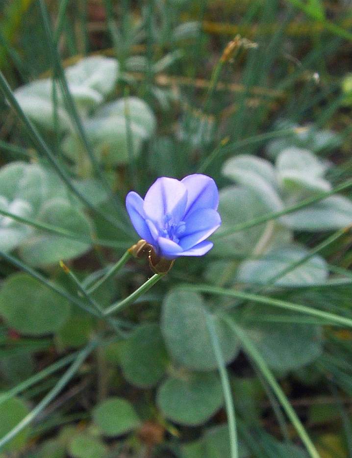 Immer wieder beeindruckt die "blühende Binse" Aphyllanthes monspeliensis mit ihren kleinen, aber zahlreich an den Spitzen erscheinenden blauen Blüten, hier vor dem Hintergrund der filzig-grauen Blätter des kretischen Origanum dictamnus.