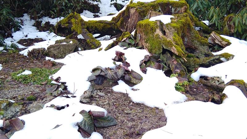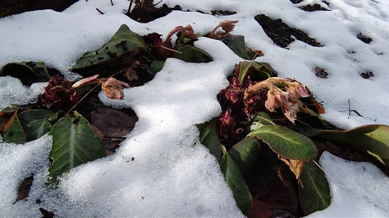 Chrysosplenium macrophyllum schiebt sich durch die Schneereste.