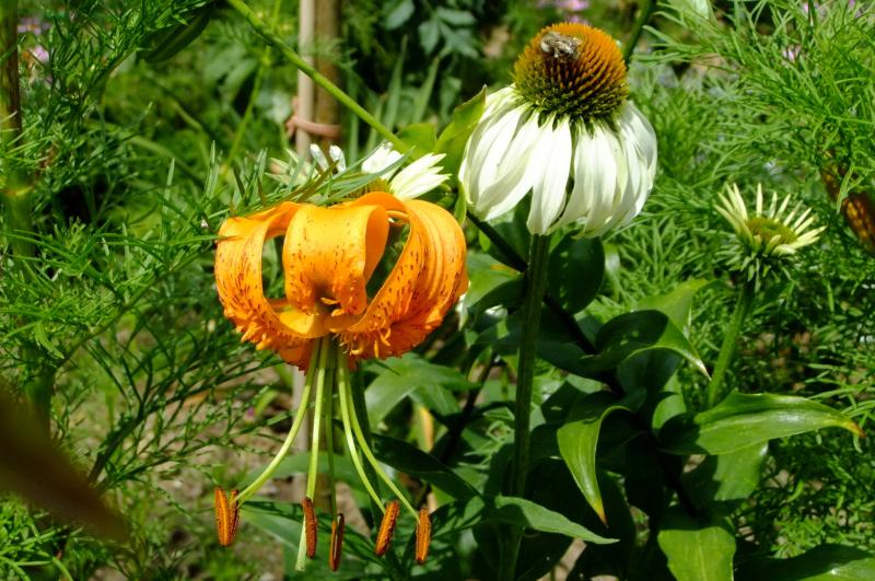 Die "Virgin" hat eine Bekannte auch sehr gelobt, habe die im letzten Frühjahr nicht mehr bekommen und deshalb "Alba" gepflanzt.Im ersten Jahr hat sie gut und lange geblüht. Jetzt bin ich mal gespannt, wie sie sich in Zukunft hält. Später im Jahr habe ich noch eine Virgin dazugepflanzt. Die Blütenformen sind jedoch so verschieden, daß die Virgin einen anderen Platz bekommen hat.Hier Alba mit Lilie Henryi.
