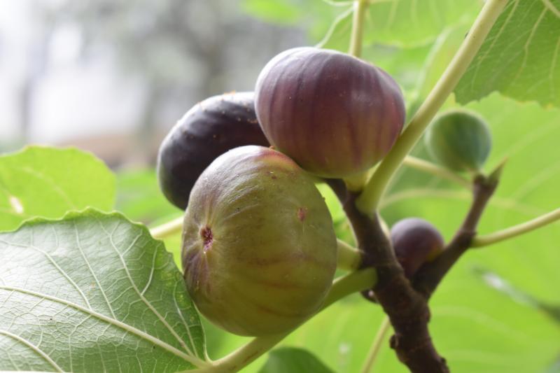 Pastiliere Feigen in diversen Reifestadien, von noch ganz grün über bereits beim Umfärben bis hin zu praktisch pflückreifen Früchten.