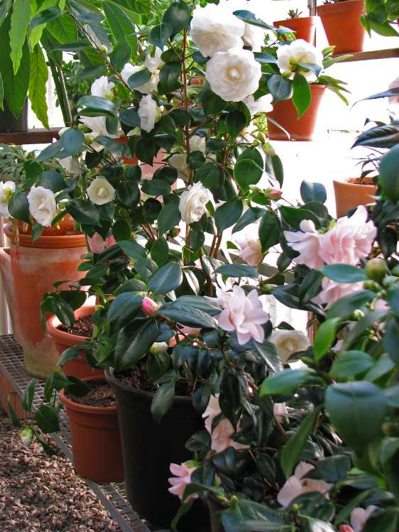 Voll in Blüte stehen auch: 'Nuccio's Gem' und davor 'Hakoromo' Camellia japonica.Die anderen verharren weiterhin in Wartestellung.Gruss Christa