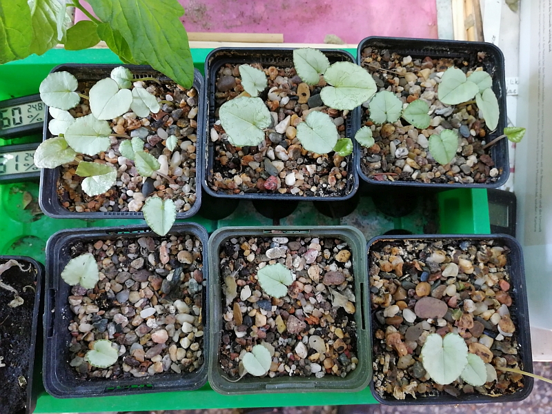 Im Januar hatte ich ein paar Silbertaler (Sämlinge von C. hederifolium) gezeigt, von denen ich einen Schwung getopft hatte. Sie treiben gerade frische Blätter und man kann schon erste Unterschiede erkennen. Die im Garten zeigen sich dagegen noch gar nicht :-\.