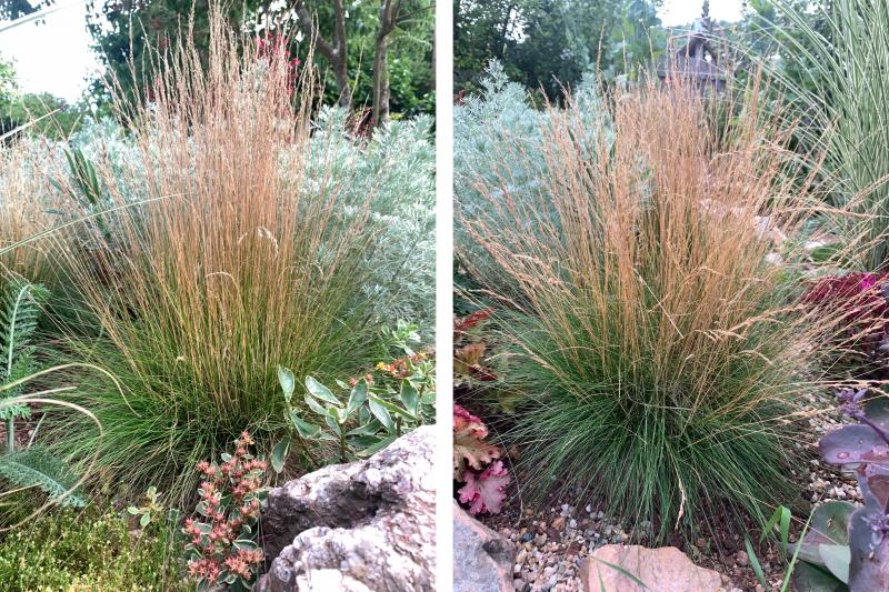 Weitere Beobachtung heuer: Diamantgras braucht mehr Wasser als man glauben würde. Das mickert heuer dahin (ich weigere mich das Fast-Nur-Gräser-Beet zu gießen) und scheint die Blüte zu verweigern. Sehr interessant. Ich bin am Experimentieren. Was die Trockenheit und Hitze nicht packt, muss gehen. Bald werde ich wohl eine Schizachyrium Monokultur haben ;). Denen gefällts, es ist grad die Zeit, wo sie in diesem herrlcihen graugrün mit Lila-Schattierung brillieren. :D Und selbst Panicum scheint die Trockenheit besser zu verkraften als das Diamantgras.