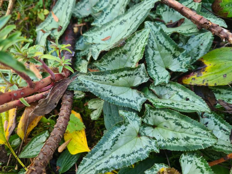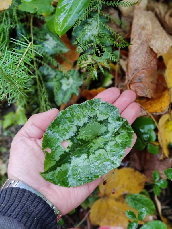 Da im Wald auch niemand Laub fegt, würde ich auch meinen, dass Cyclamen und Co. durchaus gut mit einer Laubdecke zurechtkommen, vielleicht ist der gelegentliche Riesenwuchs bei den Blättern sogar darauf zurückzuführen, dass sie aufgrund des Lichtmangels halt einfach mehr Blattmasse bilden, wenn die Stängel nicht ausreichend in die Länge wachsen können, um das Laub besser ans Licht zu bringen. Ganz allgemein sind insbesondere die Herbstalpenveilchen ja erstaunlich genügsam und robust. Letztes Jahr hatte ich auch so ein Exemplar mit ein paar großen Blättern, dieses Jahr sieht es wieder normal aus.