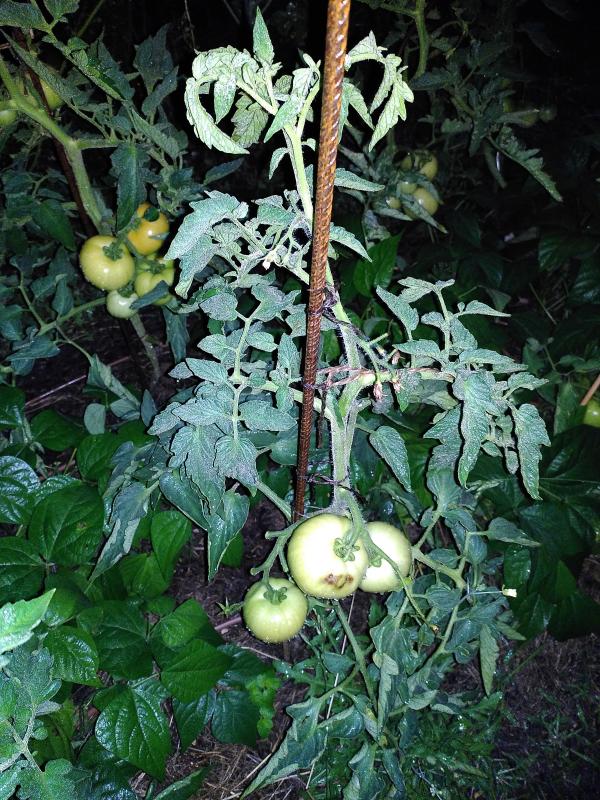 Ich muss gestehen, dass die Tomaten hier sich selbst überlassen waren, abgesehen von 1 Handvoll Tomatendünger und einer Schippe Kompost bei der Pflanzung. Nie gegossen, nicht ausgegeizt, schlecht angebunden. Mea culpa ;D