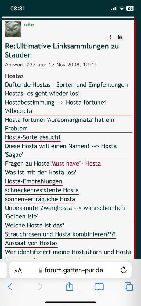 Jetzt musste ich erstmal die "ultimative Linksammlung zu Stauden" suchen, aber nein, diese Links können gar nicht funktionieren, weil da irgendwelche HTML-Seiten verlinkt werden, die es gar nicht gibt. Ich vermute, die stammen noch aus dem uralten Forum, was es ebenfalls schon lange nicht mehr gibt. Vielleicht gibt es die Threads noch, Du kannst ja mal versuchen, mit der Suchfunktion nach den Threadtiteln zu fahnden.