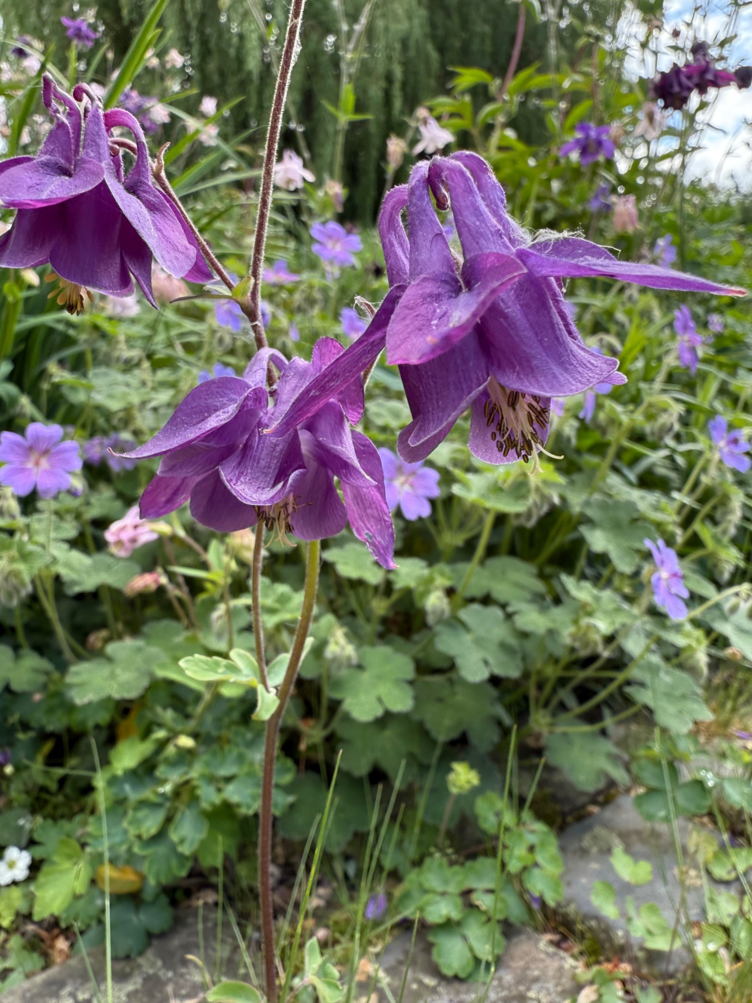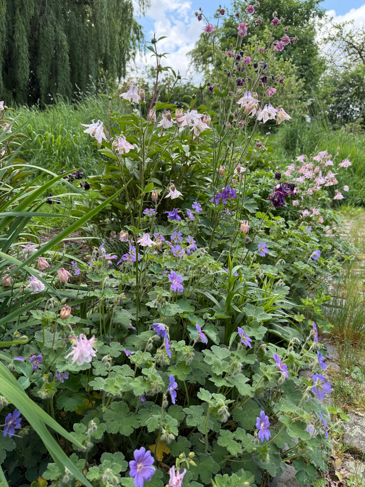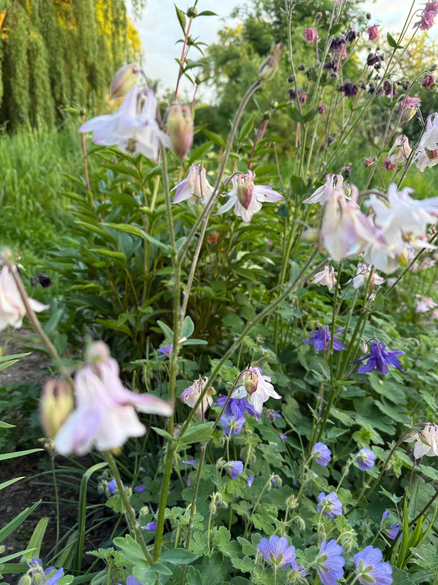 Hier sind die Akeleien noch nicht so weit. Nur 'Miss Huish' blüht. Und die Rosenkugel verrät, dass ich wie immer 'quick and dirty' mit dem Smartphone fotografiere.