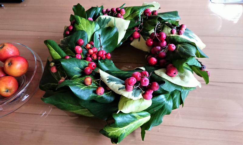 Hier habe ich es jetzt auch einmal mit Efeublättern im Kranz versucht. Etwas derb sind die Blätter von Hedera colchica ja schon, aber auch von interessanter Struktur und leicht zu befestigen, da die Blattstiele recht lang sind.