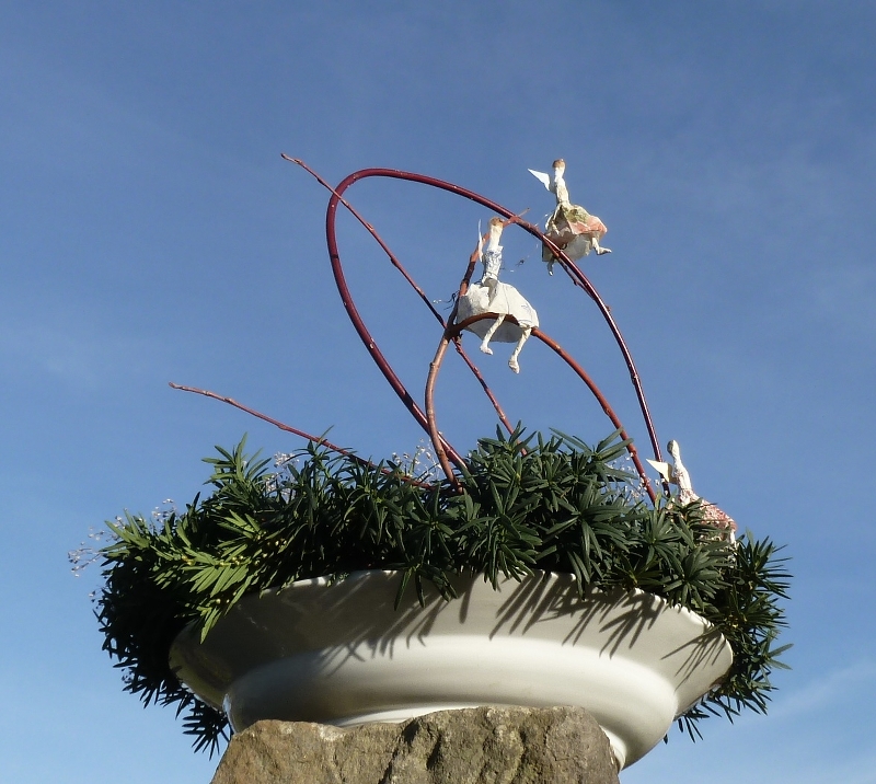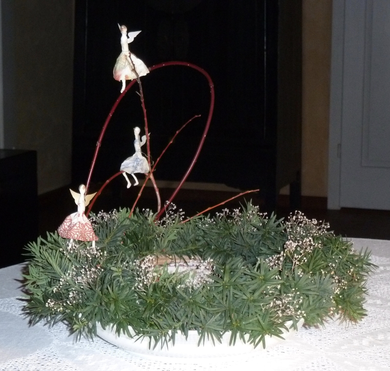 Der Advent kommt bald, ich hab schon mal einen Kranz gebunden. . Während ich aufräumte, hab ich ihn auf einen Stein gestellt. Und dann hörte ich ein Kichern und Wispern und Prusten - da hatten doch drei Miniengel das Ding entdeckt und hielten es für ein Turngerät. :o .