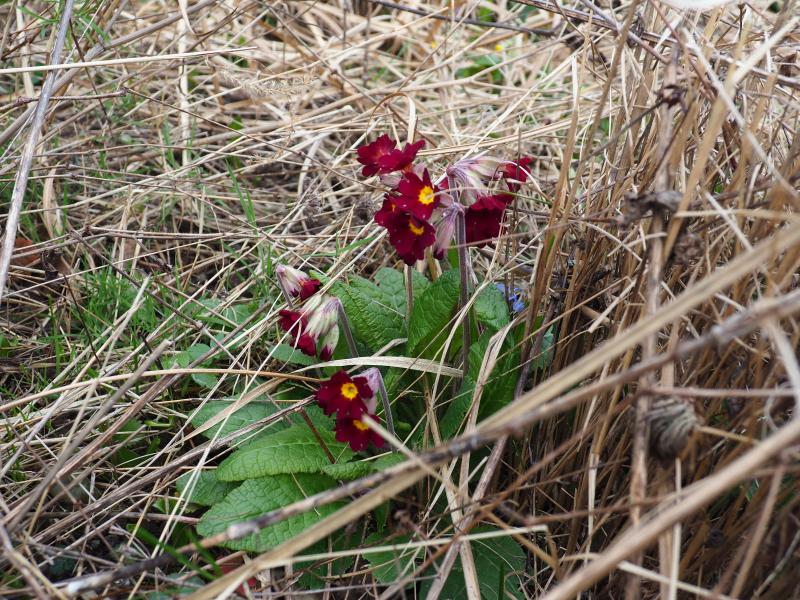 so, zwei für Krokosmian. Ein kleinblütiges tief rotes sehr frühes in der Pflanzung mit Primula veris.