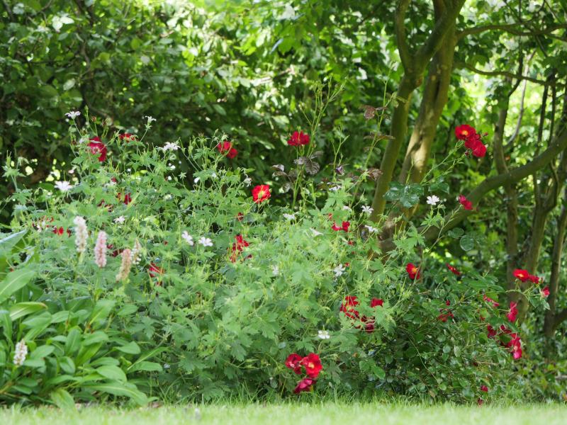 Im Schatten unter dem großen Satomi verweben sich Knöterich, Geranium und eine Rose, die noch gepflanzt wurde als der Satomi noch ganz klein war und dort viel Sonne hinkam.