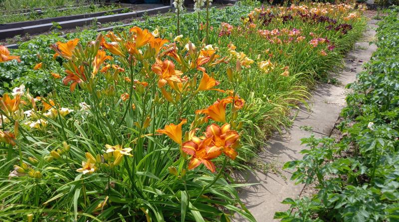 Und hier als Pflanzpartner der knallroten Monbretien. Ich habe mal versucht, die Zwiebeln auszugraben und vielleicht an geeignetere Sonnenstellen zu versetzten. Das hat gar nichts gebracht. Die sind vom Vorbesitzer vermutlich vor Jahrzehnten damals noch sonnig gesetzt worden und haben inzwischen hunderte von Tochterzwiebeln. Deshalb habe ich mich jetzt entschieden, mit der farblich doch etwas gewöhnungsbedürftigen Kombi zu leben: