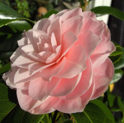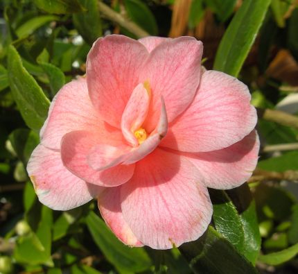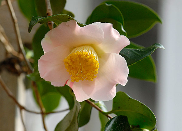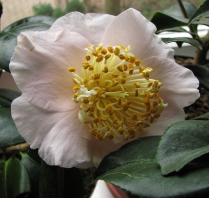 Da ich bisher nur zwei Kamelien ausgepflanzt habe (die schlafen tatsächlich noch), geht es jetzt Schlag auf Schlag. Heute die erste Blüte von der Higo, 'Nana Komachi'. Ausgepflanzt wäre sie ein Bodendecker! Im Topf hängen die Äste graziös über.