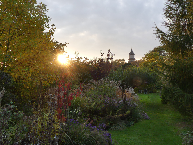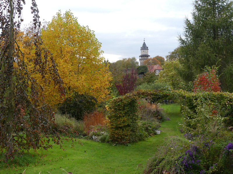 Der Blick zurück. Hinter dem Heckenbogen spitzt Sorbus 'Autumn Spire' hervor.