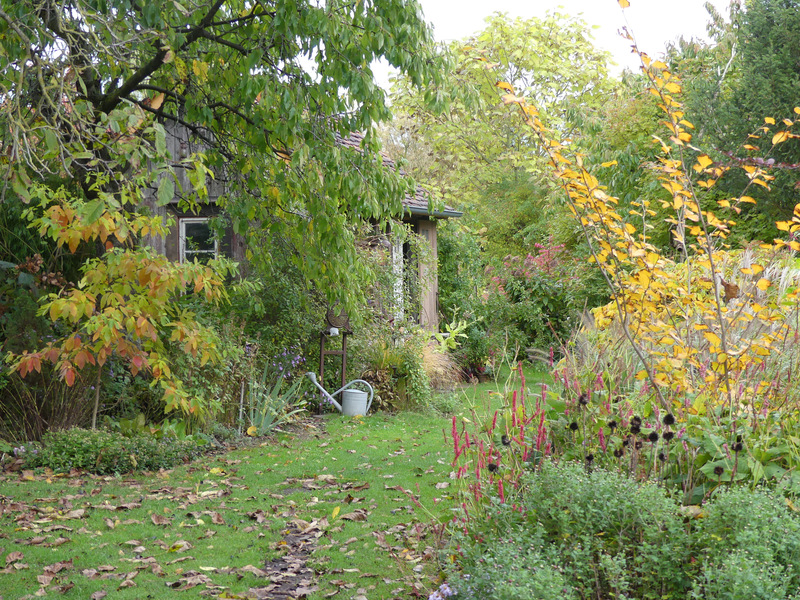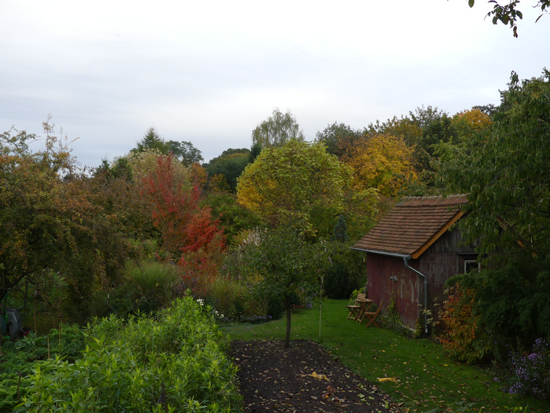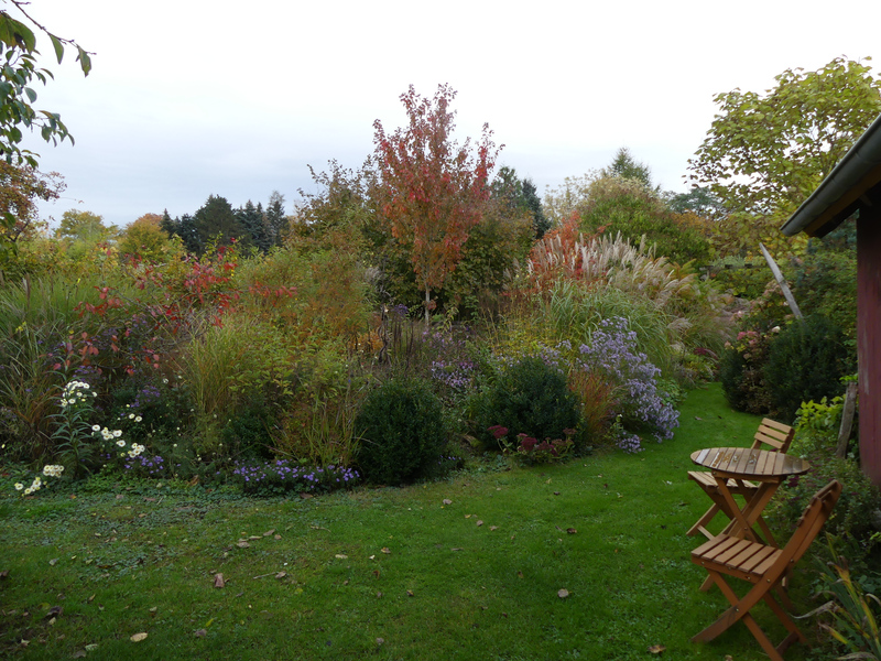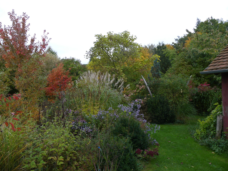 Blickt man nach rechts am Gartenhaus vorbei, erspäht man schon Euonymus alatus.