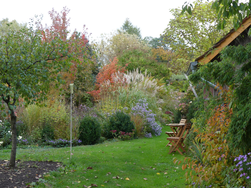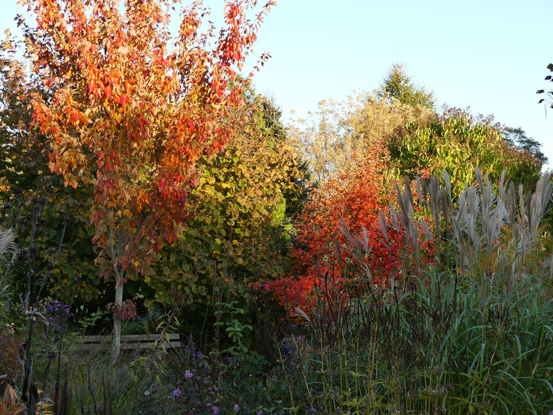 Amelanchier lamarckii leuchtet schon kräftig, nun macht ihr Acer 'Jeffer's Red' langsam Konkurrenz.