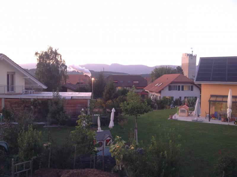 Blick aus der Terrassentür im Wohnzimmer. Wenn die Krone der Eberesche vor dem Sichtschutz größer wird, sehe ich die Häuser nicht mehr.