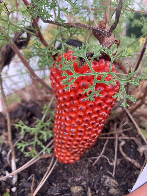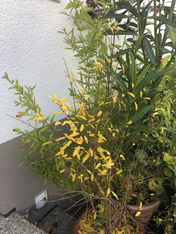 Der Granatapfel verabschiedet sich dreigeteilt- vorne kahl, in der Mitte noch gelb und hinten blühend und grün 😆