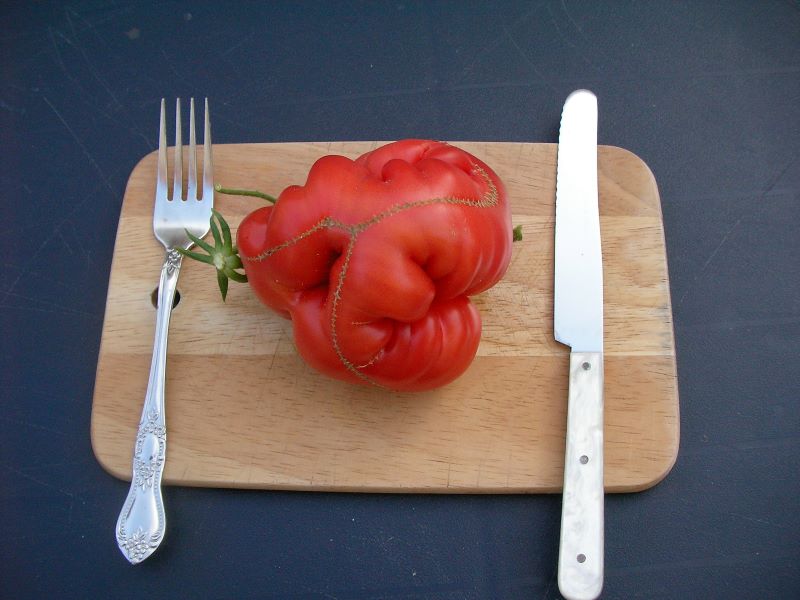 Die geht glaube ich auch ohne Obduktion und Narben als Tomate durch. Fast 600 g und nein, ich habe keine kleinen Hände