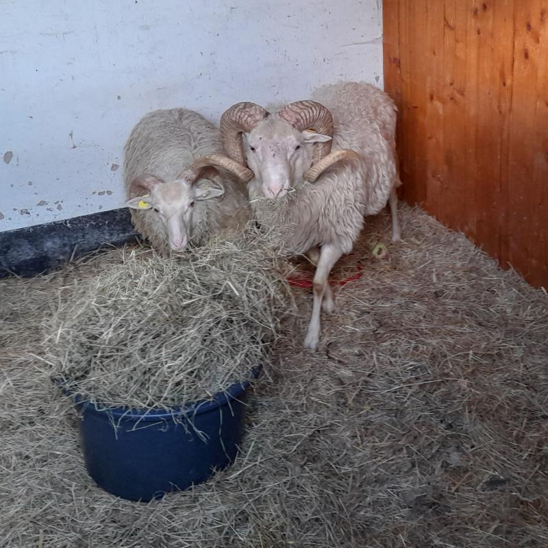 Ja sich auf Bocklämmer einzuschießen... ist sinnvoll. Mit ach und krach bekamen wir den Altbock in den Stall. Die beiden sind wirklich ein eingespieltes Team. Die mümmelten gleich friedlich Heu. Anfang der Woche fahren wir den Großen ja aus und nehmen selber einen Großen mit. Der soll sehr friedlich sein. I hope so.