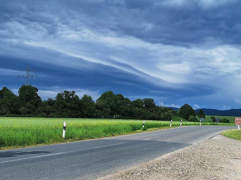 Auf dem Heimweg heute stand im Nordwesten diese Shelfcloud. Sie muß so bei Herzberg am Harz gewesen sein. Durch das vorgelagerte Pöhlder Becken ist viel warme Luft vorhanden, sodaß sie sich gut aufladen konnte.