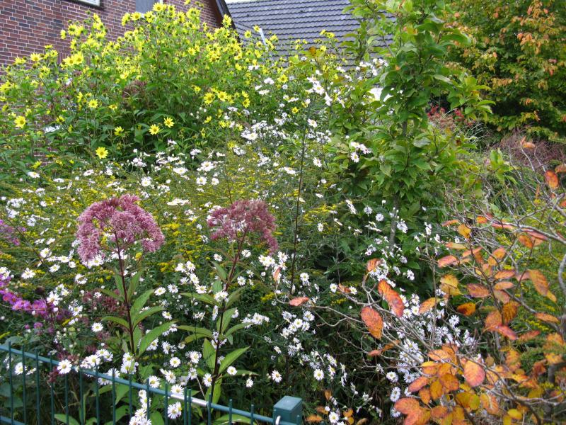 Diese weiße Aster ist erst letzte Woche richtig aufgeblüht. Sie stand jahrelang im Vollschatten und war dort nur ein vor sich hin lümmelndes Ding.