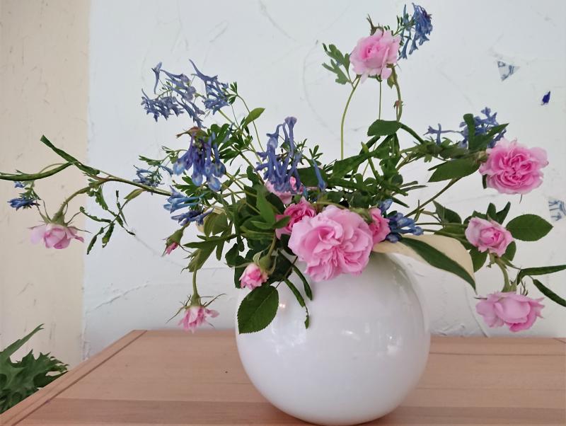 Deshalb hier ein neuer Strauß mit den ersten Rosenblüten von einer unbekannten Sorte, die hier in der Hecke wuchert!