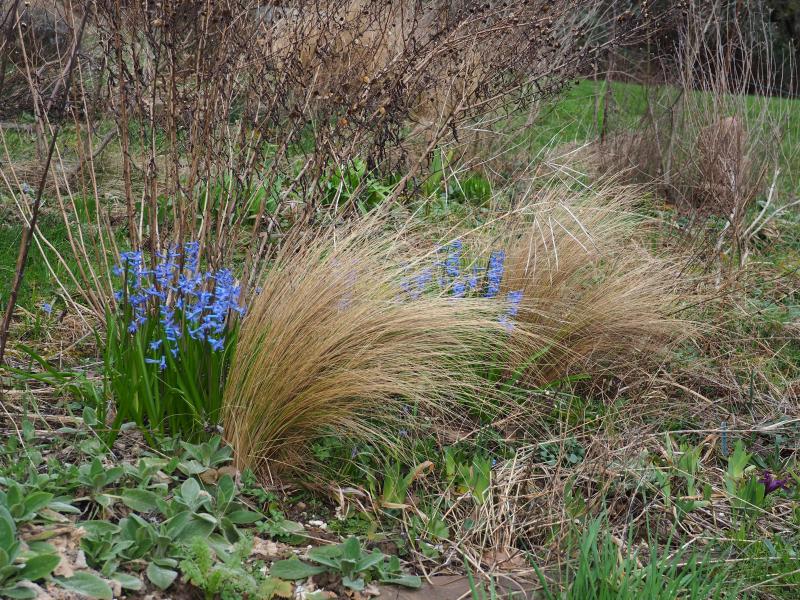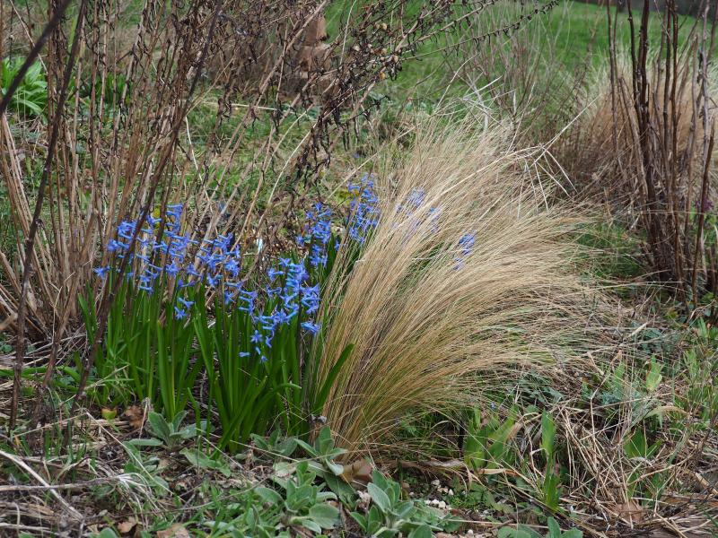Noch schöner wäre das Bild vielleicht, wenn Du noch ein, zwei Schritte nach rechts machen könntest. Aber die blauen Hyazinthen, die so wunderbar straff aufrecht stehen, sind ein herrlicher Kontrast zu den sanft geschwungenen, beigefarbenen Gräsern! :D