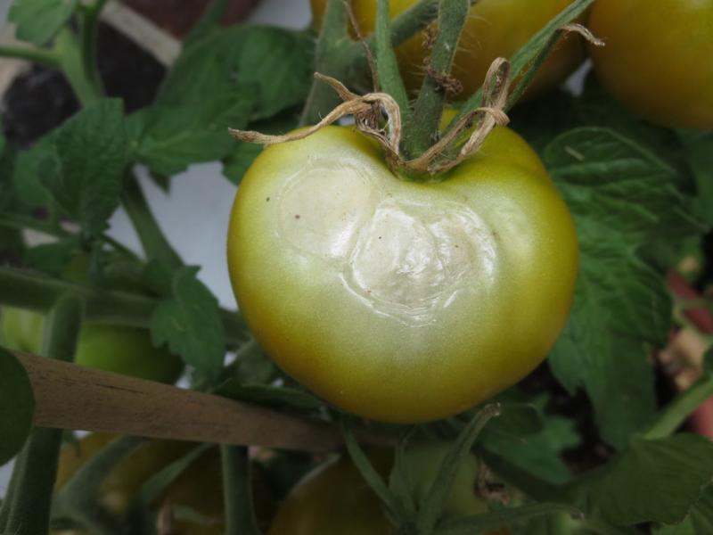 Eine Tomate (Lime Green Salad, die ich sehr gerne esse) bekommt trotz regelmäßiger Wassergaben Sonnenbrand. :'(