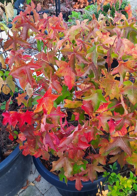 Mein Liquidambar styraciflua 'Gumball' legt jetzt erst richtig los. Ich bin beeindruckt! Noch ist er im Kübel untergebracht, soll aber nächstes Jahr definitiv ein würdigeres Plätzchen bekommen. Oder zumindest einen viel schöneren Kübel und Einzelstellung...
