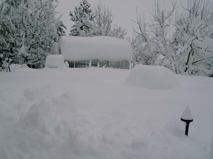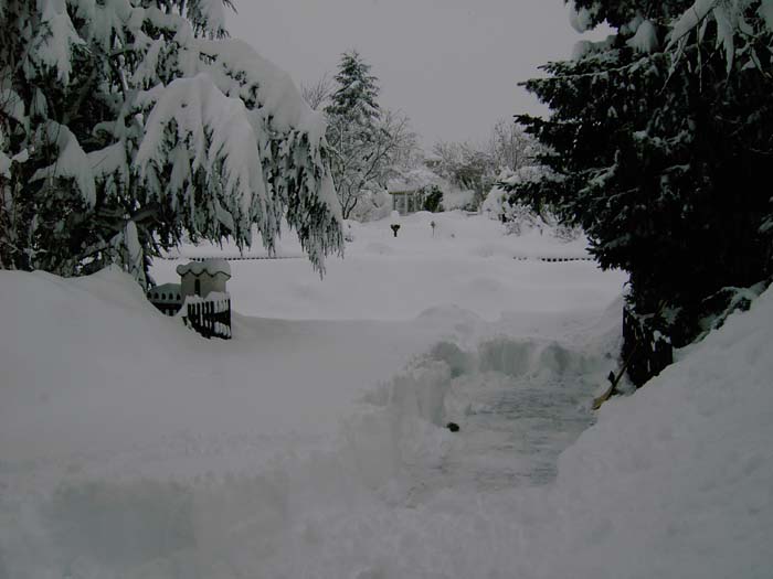 wir haben heute morgen zu zweit über 2 Stunden Schnee geschaufelt und Bäume abgeschüttelt - und das war nur das nötigste. Im Garten hat es ca. 1m Schnee. Bin beim Abschütteln der Bäume bis zur Hüfte eingesunken. Sooo viel Schnee hab ich hier auch noch nie gesehen