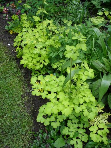 Bei meinen Akeleien kann ich gar nicht mehr so recht sagen, zu welcher Gruppe sie gehören.Sicherr ist nur, dass sich die langspornigen Hybriden alle schon vor langer Zeit verabschiedet haben, sie waren sehr kurzlebug und haben auch nicht für Nachwuchs gesorgt (allerdings muss ich gestehen, dass ich immer mal wieder auf eine solche Schönheit reinfalle, wenn ich über den Markt gehe). Als einzige langspornige habe ich in diesem Jahr nochmal einige Exemplare von A. chrysantha gekauft, aber die blühen noch nicht, Foto daher später.Dafür gibts an allen Ecken und Enden Mischlinge, z.T. sehen sie wie die ganz normalen A. vulgaris aus, deren Samen ich ins Beet geworfen hatte: