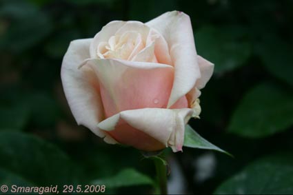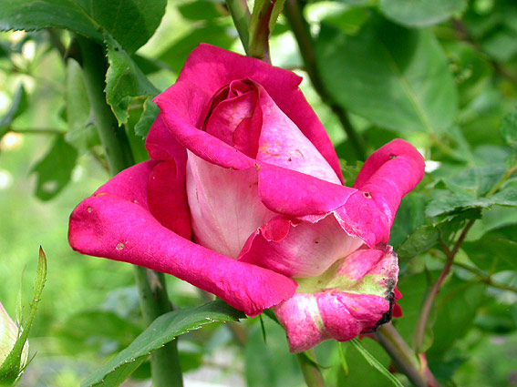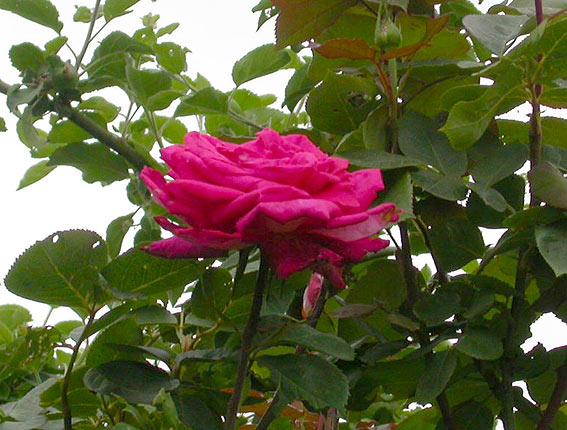 Diese inzwischen 2 m hohe Edelrose steht seit einigen Jahren in meinem Garten. Sie ist ein Monster. Sie wächst mit dunkelroten Neutrieben straff aufrecht und ist kräftig bestachelt. Nur mit Pfosten kann ich sie etwas in die Breite ziehen.Ich habe schon öfter Fotos von ihr eingestellt, und letztes Jahr habe ich sie sogar mit viel Mühe bei helpmefind bestimmen können! Hätte ich nur den Namen aufgeschrieben... ich habe mir eingebildet, ihn nach so langer Suche nie wieder zu vergessen.