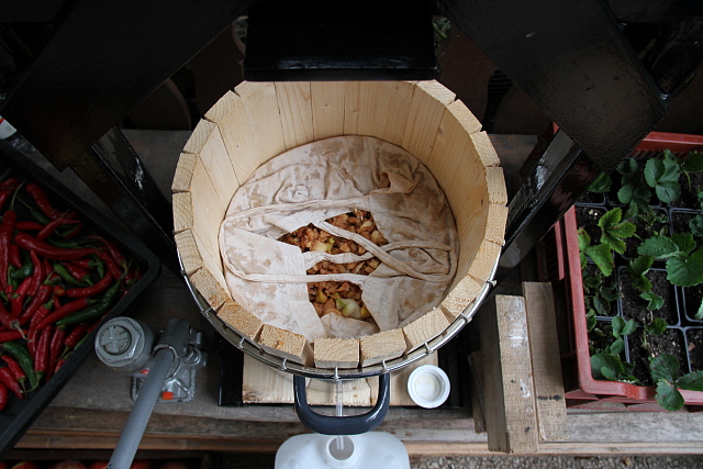 Der Holzkorb ist keiner, das sind einfach nur Latten die in den Topf gehängt werden, bleiben an einer Schraube am Topfrand hängen, durch die Lücken zwischen den Brettern läuft der Saft nach unten. Da ist auch ein Holzsiebboden ganz unten drin und ein Loch in den Topf gebohrt für den PVC-Schlauch der den Saft rauslässt.