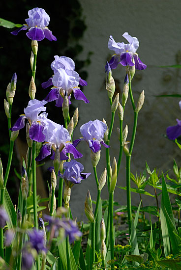 Aus aktuellem Anlass noch einmal die Iris germanica 'Florentina', sie ist die eigentliche Veilchenwurzel, sagt man. Sie blüht früh, wie ihre blauen Schwestern. Sie ist weiß mit irisierendem hellblauen Schein und hat eine olivgrüne Schlundzeichnung der Bart ist weiß bis gelb. Das Laub zieht im Winter nicht ein. Die Blüte bringt eine Höhe von sagen wir mal 70 cm. Links sind hier am Anfang dieses Themas.so sieht sie aus
