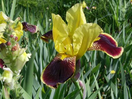 Die Iris x flavescens ist eine spät blühende Hybride aus Iris pallida und Iris variegata sie ist die eigentliche Bauerngarten iris und an Durchsetzungswillen mit fast keiner anderen Staude zu vergleichen. Daher hat sie jeder, ob er will oder nicht. Als Züchter ist De Candole 1813 angegeben, möglich, dass das der erst war, der die Pflanze beschrieben hat und in Umlauf brachte. Redoute hat auch sie gemalt. Ich habe sie fotografiert.Mit 'Rheintraube' im Hintergrund.