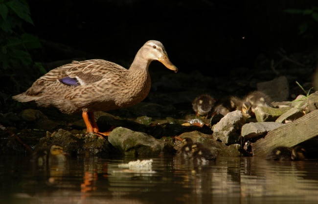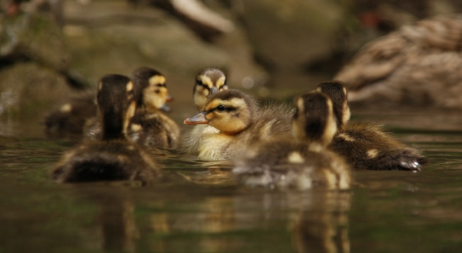 wollte heuer eigentlich niemand Enten brüten lassen... eine Ente war aber besonders clever, hat sich ein Versteck gesucht und sich nie erwischen lassen, geschweige denn bis zum Nest verfolgen. Weil es hier viele Füchse gibt, dachte auch niemand, dass das außerhalb des Stalles gelingen könnte.... Nunja. Freitag Nachmittag kam sie dann stolz dahergetrippelt, nachdem sie die letzten Wochen kaum zu sehen gewesen war. Und hatte sieben allerliebste Küken mit! Jetzt freuen sich natürlich alle und hoffen, dass es hauptsächlich Enten werden...Hier die Mami mit ihren Kids.