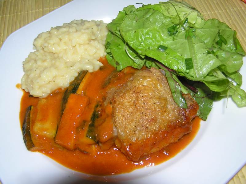 heute gabs hähnchenunterkeulen mit lunas paprikasoße (mhh, sehr lecker luna), allerdings mit zucchinistücken drin.dazu risotto und gartensalat mit kresse und zwiebelschlotten.
