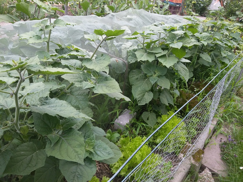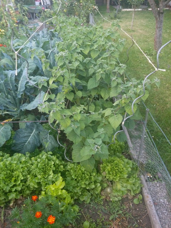 Ich habe das mal mit Physalis gemacht, diese gestäbt bzw als Y-Reihe erzogen, das schafft untendrunter Platz für Salat.