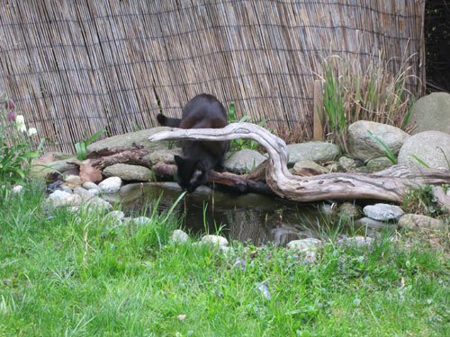 Und hier noch ein aktuelles Bild von heute: Mein Kater trinkt Teichwasser. Momentan ist nicht viel zu sehen, ich habe erst kürzlich die Gräser zurückgeschnitten. Links am Rand stehen ein paar Schachbrettblumen.