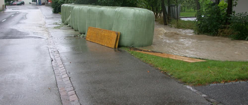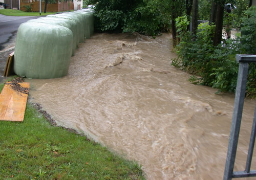 Neoprenanzug hätten wir hier auch brauchen können. In genau 24 Stunden kamen 90 lt runter. Eigentlich wollte ich je heute morgen die regenfesten Rosen fotografieren. Aber das rauschen des Baches ein Haus weiter liess mich Stiefel, Hut und Regenjacke schnappen. Der Dorfbach, meistens ein braves Bächlein 1,5 m breit und mit 10 cm Wasser, gerade richtig für ein Hundefussbad in der heissen Sommersonne, war heute geschwollen. Mächtig drängt es ihn über den Rand des Ufers in Richtung auf der anderen Seite der Strasse stehende Liegenschaft und in einen Baumgarten. Noch knapp 10 cm mehr und die Ueberflutung wäre komplet gewesen. So blieb es mehrheitlich bei überfluteten Gärten. Rundherum war es aber sehr viel schlimmer. Die Aare und grössere Bäche richteten immensen Schaden an.
