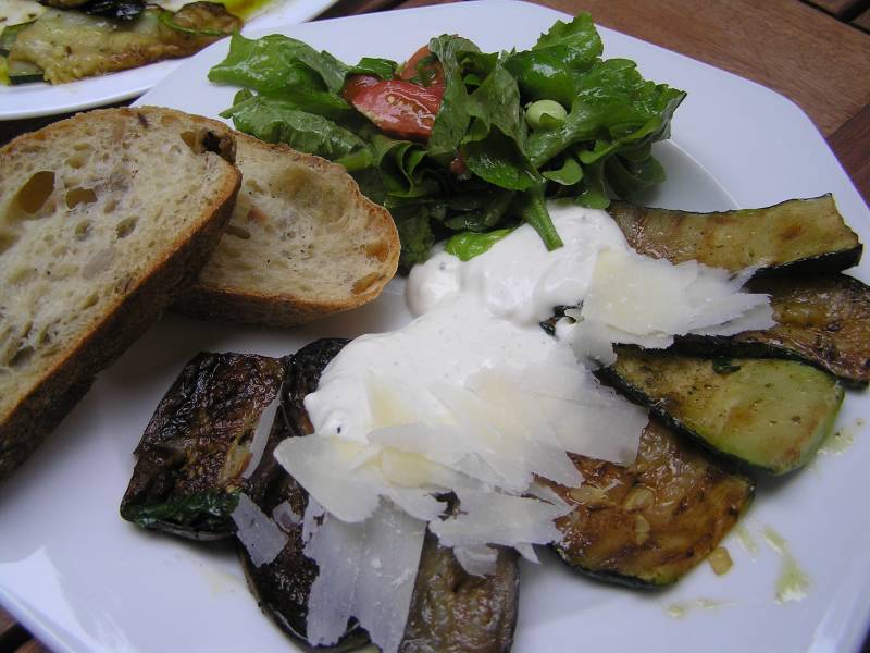 gebratene auberginen und zucchini aus dem garten, dazu sauerrahmsößchen, parmesanspäne, olivenciabatta und gemischter gartensalat aus forellenschuß, eichblatt, tomaten, inkagürkchen, zuckererbsen, asiasalat und eisperlensalat