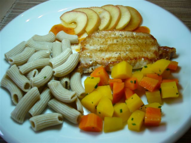 heute gab es:bunter Tomatensalatein kleines Steak an Calvados-Sauce mit caramelisierten Äpfeln, Penne und gedänpfte Karotten