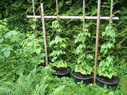 Stangenbohnen stehen im Kübeln bei den Beerensträuchern.