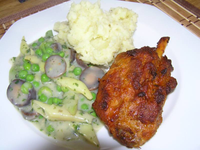 wir hatten gerade minischweinehaxen mit kartoffelbrei und auch gartengemüse.erbsen, gelbe bohnen und lila karotten mit viel petersilie.