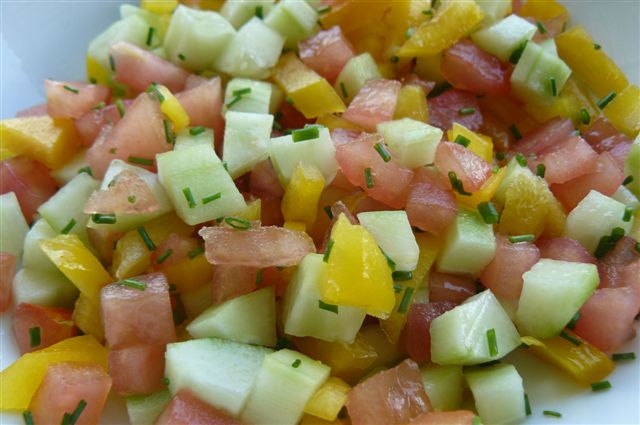 heute Abend gab es einen bunten Salat aus Tomaten, Gurke und Paprika, dazu geröstetes Knoblauchbrot